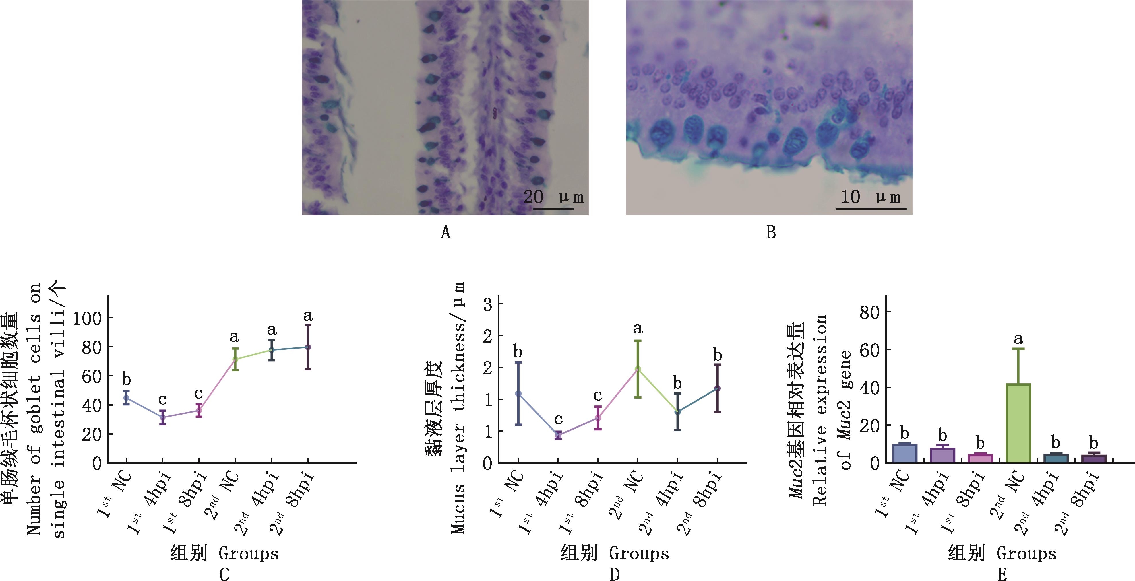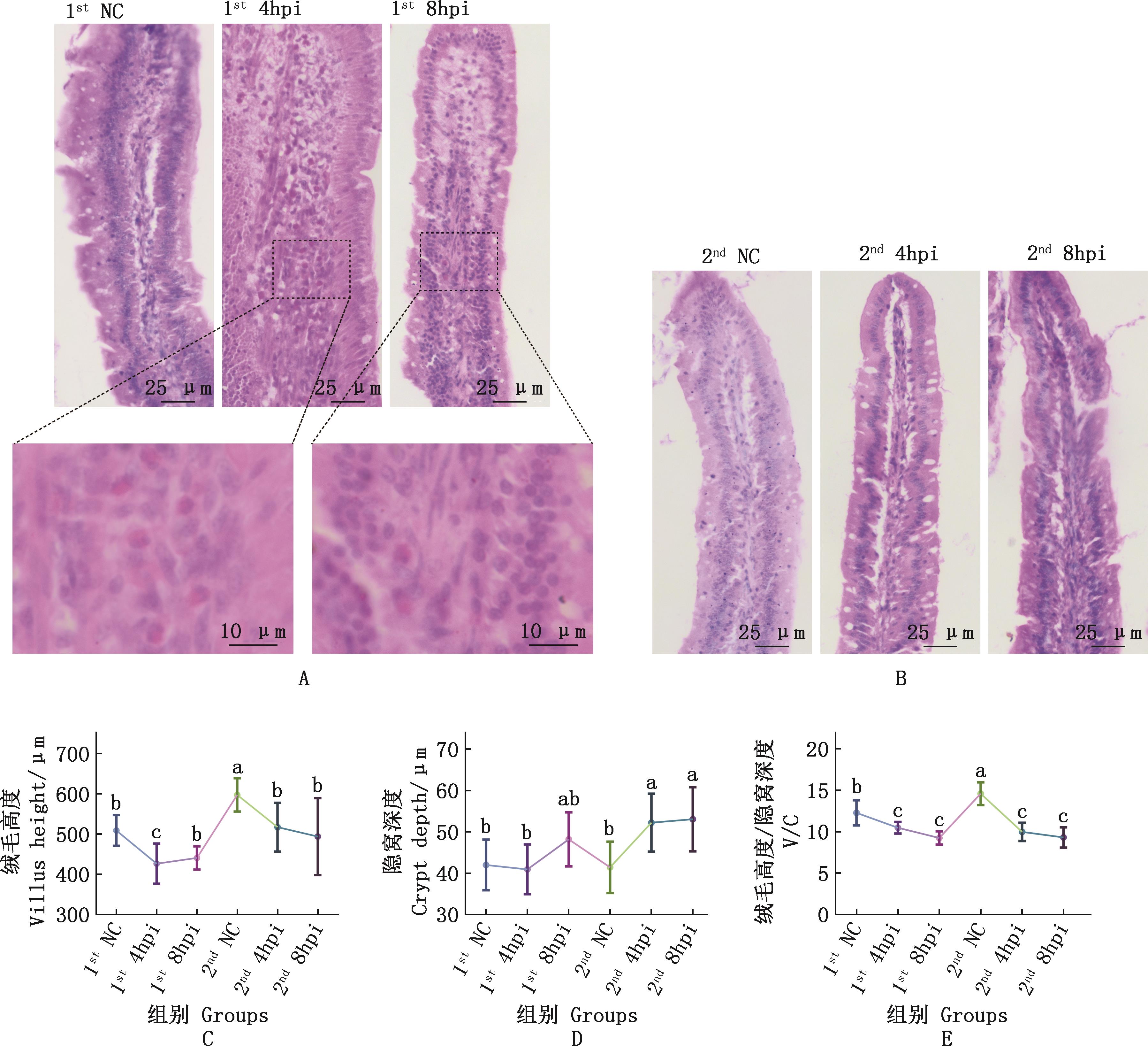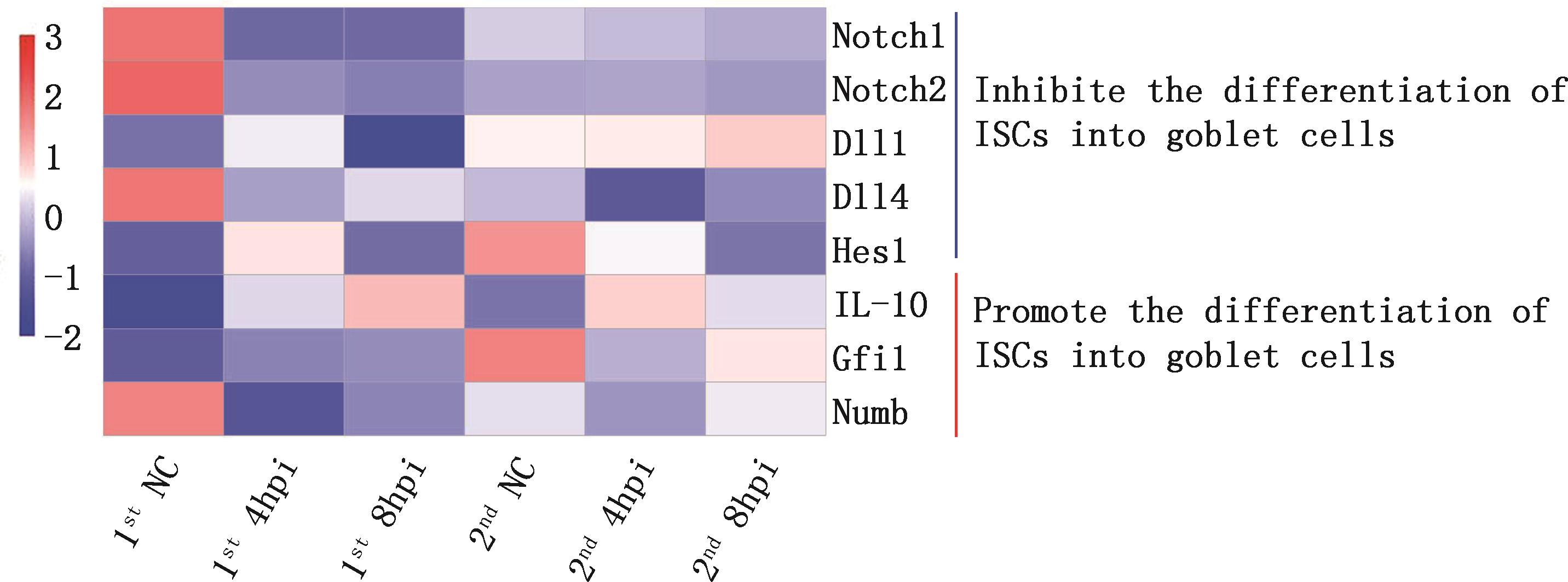 目的 研究蛋鸡肠黏膜在经历损伤后对再次损伤的抵抗力是否增强,并探究其可能机制,为探索促进蛋鸡肠黏膜损伤修复的手段提供新视角。 方法 选取78羽7日龄海兰白雏鸡,分为13个处理组(每组6羽),随机选取6羽雏鸡腹腔注射PBS作为阴性对照组,记为1st NC组;另外72羽雏鸡采用腹腔注射脂多糖(LPS,10 mg/kg BW)诱导肠黏膜损伤,在注射后1、2、4、6、8、24 h分别随机选取6羽雏鸡处死并采样,记为1st Xhpi(hours post injection)组(X代表注射后的采样时间)。在注射后48 h时,从注射LPS的雏鸡中随机选取6羽雏鸡腹腔注射PBS,作为第二阴性对照组,记为作2nd NC组(视同1st 48hpi组),剩余雏鸡第2次注射同剂量LPS。在第2次注射LPS后1、2、4、6、8 h分别随机选取6羽雏鸡处死并采样,分别记为2nd Xhpi组。所有组雏鸡采集血液、十二指肠组织并分离肠隐窝,分析其屏障功能、肠道干细胞(intestinal stem cells,ISCs)活性及隐窝微环境的变化。 结果 在LPS诱导损伤后,1st 4hpi组肠黏膜出现炎性细胞浸润、绒毛高度/隐窝深度比值下降、渗透性增加及黏液层厚度降低等损伤现象。注射后48 h,2nd NC组损伤程度减轻,屏障功能增强,表现为紧密连接Ocln基因表达量、杯状细胞密度、黏液层厚度及黏蛋白Muc2基因表达量均高于1st NC组。此时,进行第2次LPS诱导损伤,与2nd NC组相比,2nd 4hpi组肠黏膜的炎性细胞浸润程度与渗透性均未显著升高,但Claudin-1基因与补体蛋白C5基因表达量显著上调(P<0.05)。ISCs分析结果显示,1st 4hpi组活跃态ISCs(active intestinal stem cells,aISCs)活性下降,之后逐渐恢复,在损伤后48 h恢复正常;2nd 4hpi组休眠态ISCs(reserve intestinal stem cells,rISCs)可快速激活并维持较高活性。肠隐窝分析结果显示,在2次损伤过程中,肠隐窝Notch信号通路均受抑制。 结论 在经历损伤修复后,肠黏膜屏障功能增强,肠隐窝局部Notch信号通路受到抑制,第2次损伤可快速激活rISCs,并促进ISCs向分泌型上皮细胞分化。