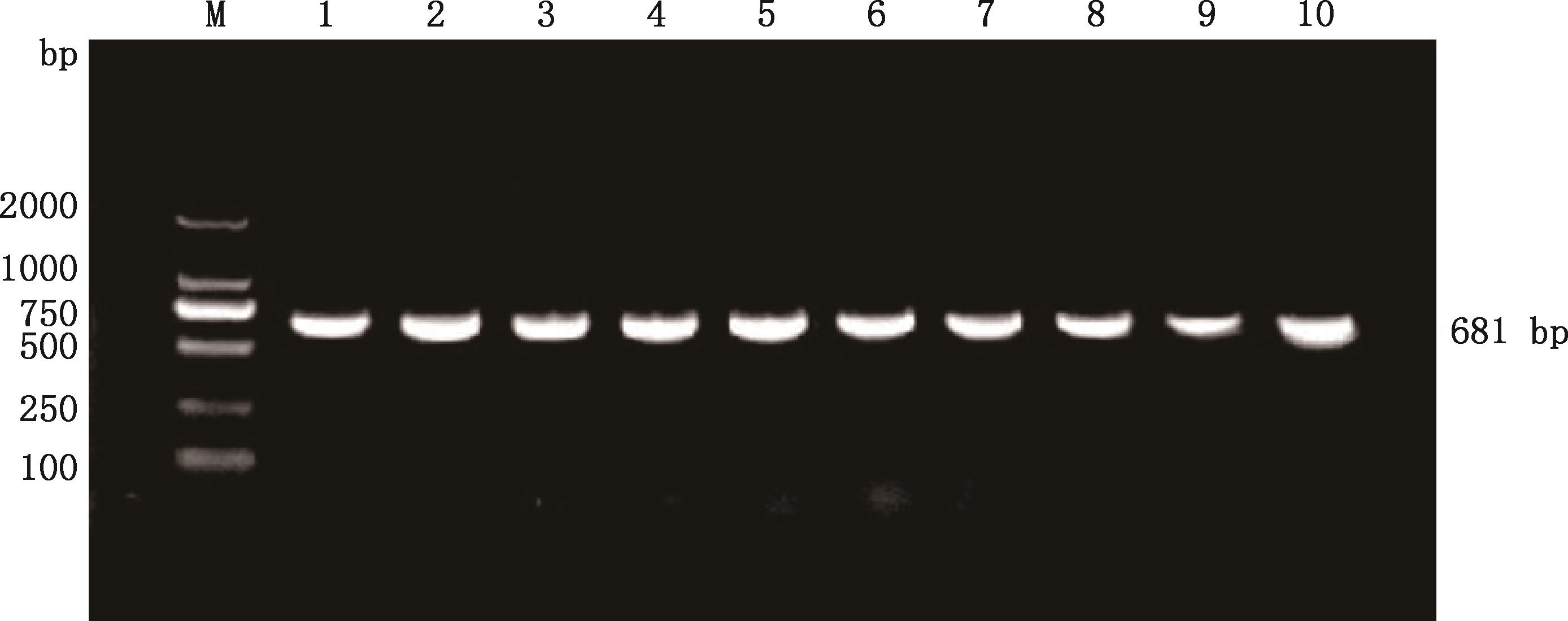 目的 探究四川肉牛真菌性皮肤病的病原,为该病的防治提供参考。 方法 采集四川各地疑似皮肤癣病的患畜皮屑,用三点接种法将采集的样本接种于皮肤癣菌鉴别培养基,将分离得到的菌株经内部转录间隔区(ITS)序列扩增后通过NCBI数据库BLAST分析基因相似性并构建系统发育树,以107 CFU/mL分离菌孢子悬液感染免疫抑制小鼠,观察临床症状和病理学特征,微量二倍稀释法探究分离菌耐药表型。 结果 从24个样本中分离到10株真菌(rntv01~rntv10)。PCR扩增结果显示,分离株均得到大小为681 bp的扩增片段;BLAST比对结果显示,分离株与疣状毛癣菌相似性为97%~100%;动物试验结果显示,免疫抑制小鼠感染该菌后皮肤出现被毛脱落、结痂、皮屑增多等症状,HE染色后观察到表皮角质层角化不全、炎性细胞增生,PAS染色后观察到大量菌丝侵染;药敏试验结果显示,除rntv10外,其余菌株对两性霉素B中介;分离菌对伊曲康唑敏感性不同,rntv09、rntv10敏感,rntv01、rntv04~rntv08中介,rntv02、rntv03耐药;rntv10对酮康唑敏感、对5-氟胞嘧啶中介,其余菌株均为耐药株;所有菌株对环吡酮胺中介,对氟康唑和特比萘芬耐药。 结论 四川肉牛真菌性皮肤病主要病原是疣状毛癣菌,该菌可引起小鼠皮肤的侵袭性感染,患病牛可用两性霉素B、伊曲康唑或环吡酮胺进行治疗。