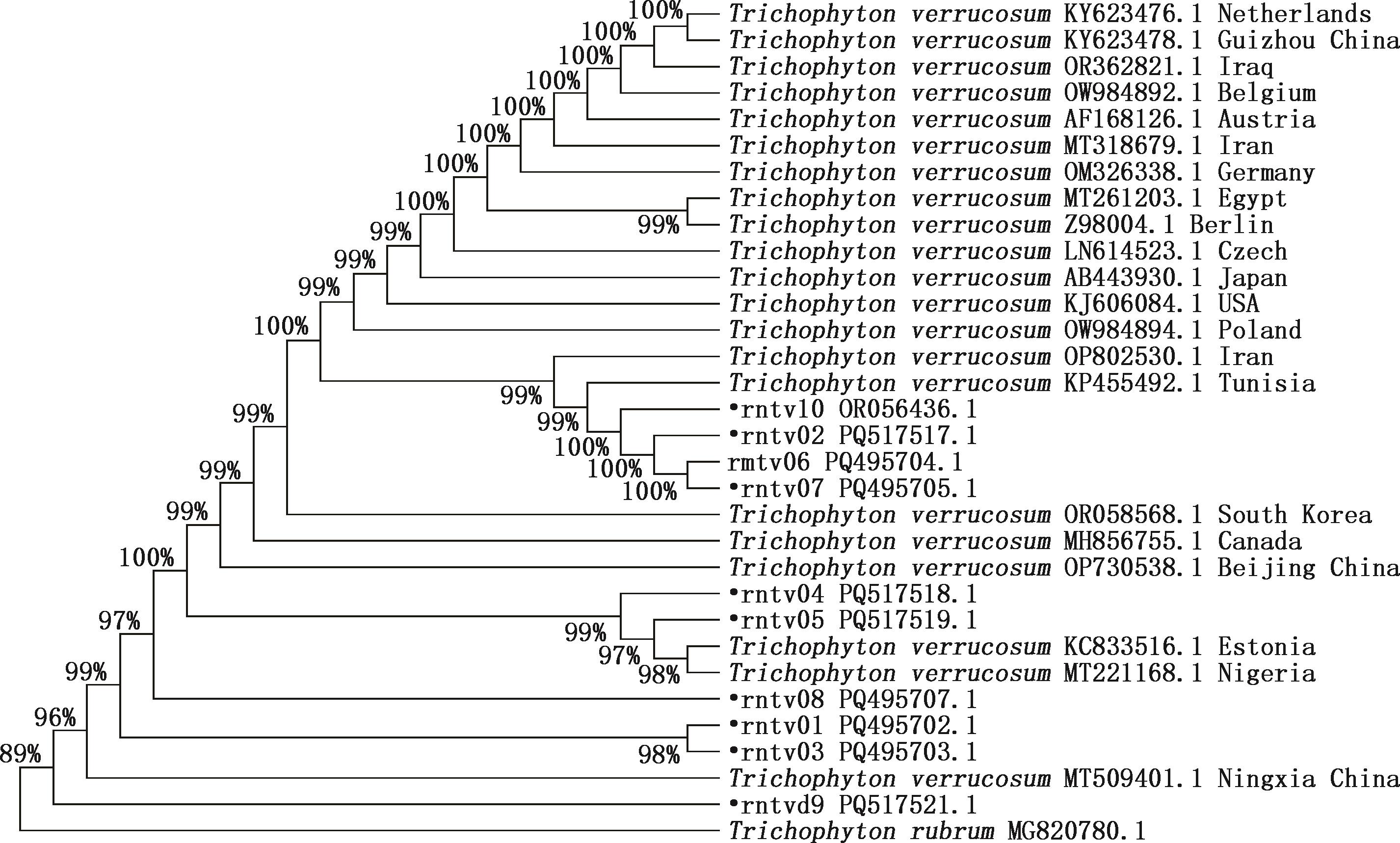 Key words: beef cattle; Trichophyton verrucosum; isolation and identification; ITS sequence; phylogenetic analysis; drug sensitivity test