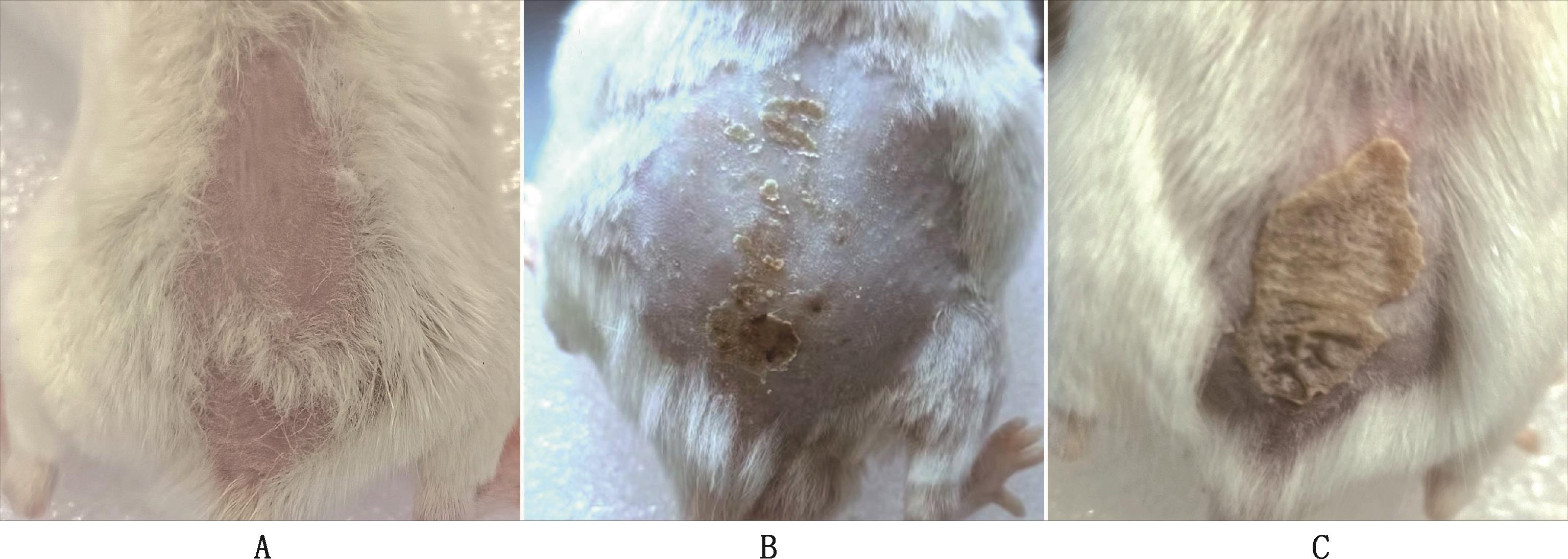Objective This study aimed to explore the etiology of fungal dermatitis in Sichuan cattle and to provide reference for prevention and control of the disease. Method Skin scabs from animals suspected of having dermatophytosis were collected from various locations in Sichuan province, and the collected samples were inoculated into the dermatophyte identification medium by three-point inoculation method. The isolated strains were amplified by internal transcribed spacer (ITS) sequence, and the genetic similarity was analyzed by NCBI BLAST and the phylogenetic tree was constructed. Immunosuppressed mice were infected with 107 CFU/mL spore suspension of the isolates to observe the clinical symptoms and pathological features, and the drug resistance phenotype of the isolates was explored by micro-double dilution method. Result Ten fungal strains (rntv01 to rntv10) were isolated from 24 samples. PCR amplification results showed that all the isolates obtained amplification fragments of 681 bp in size. The BLAST comparison results showed that the similarities between the isolates and Trichophyton verrucosum were 97% to 100%. The results of animal experiments showed that after immunosuppressed mice were infected with the isolates, their skin presented symptoms such as hair loss, scabbing, and increased dandruff. After HE staining, incomplete keratinization of the epidermal stratum corneum and hyperplasia of inflammatory cells were observed, and after PAS staining, a large amount of mycelial infection was observed. The results of the drug sensitivity test showed that, except for rntv10, the other strains were intermediate to amphotericin B. The isolated strains had different sensitivities to itraconazole, rntv09 and rntv10 were sensitive, rntv01 and rntv04-rntv08 were intermediate, and rntv02 and rntv03 were resistant. rntv10 was sensitive to ketoconazole and intermediate to 5-flucytosine, while the remaining strains were drug-resistant. All strains were intermediate to ciclopirox olamine and resistant to fluconazole and terbinafine. Conclusion The main pathogen of fungal dermatitis in Sichuan beef cattle was Trichophyton verrucosum. The fungus caused invasive skin infections in mice. Most of the diseased cattle could be treated with amphotericin B, itraconazole and ciclopirox olamine.