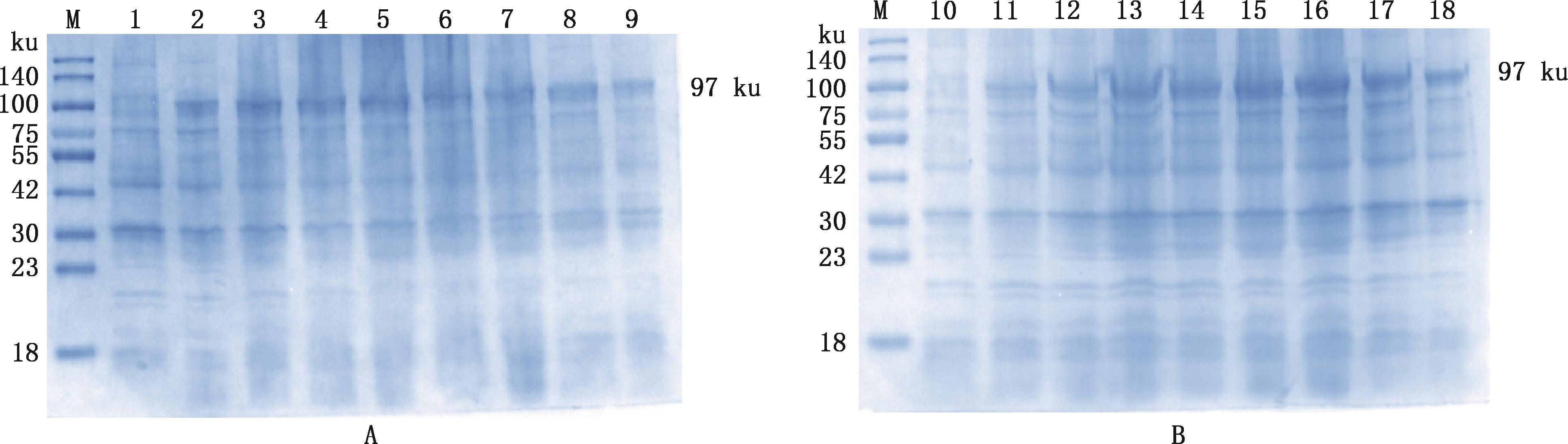 SDS-PAGE identification of recombinant GAstV ORF2 protein expression induced for 24 h (A) and 36 h (B) at 16 ℃M,Protein Marker;1 and 10, Uninduced recombinant bacteria; 2-7, Induced recombinant bacteria at 4, 8, 12, 16, 20 and 24 h, respectively; 8 and 17, Supernatant after recombinant bacteria induction; 9 and 18, Precipitation after recombinant bacteria induction; 11-16, Induced recombinant bacteria at 6, 12, 18, 24, 30 and 36 h,respectively"