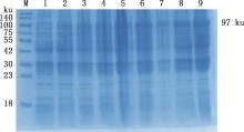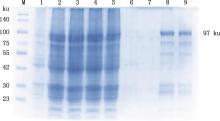 SDS-PAGE identification of recombinant GAstV ORF2 protein expression induced at 37 ℃M,Protein Marker;1,Uninduced recombinant bacteria;2-7, Recombinant bacteria 1 to 6 h after induction, respectively; 8,Supernatant after recombinant bacteria induction;9, Precipitation after recombinant bacteria induction"
