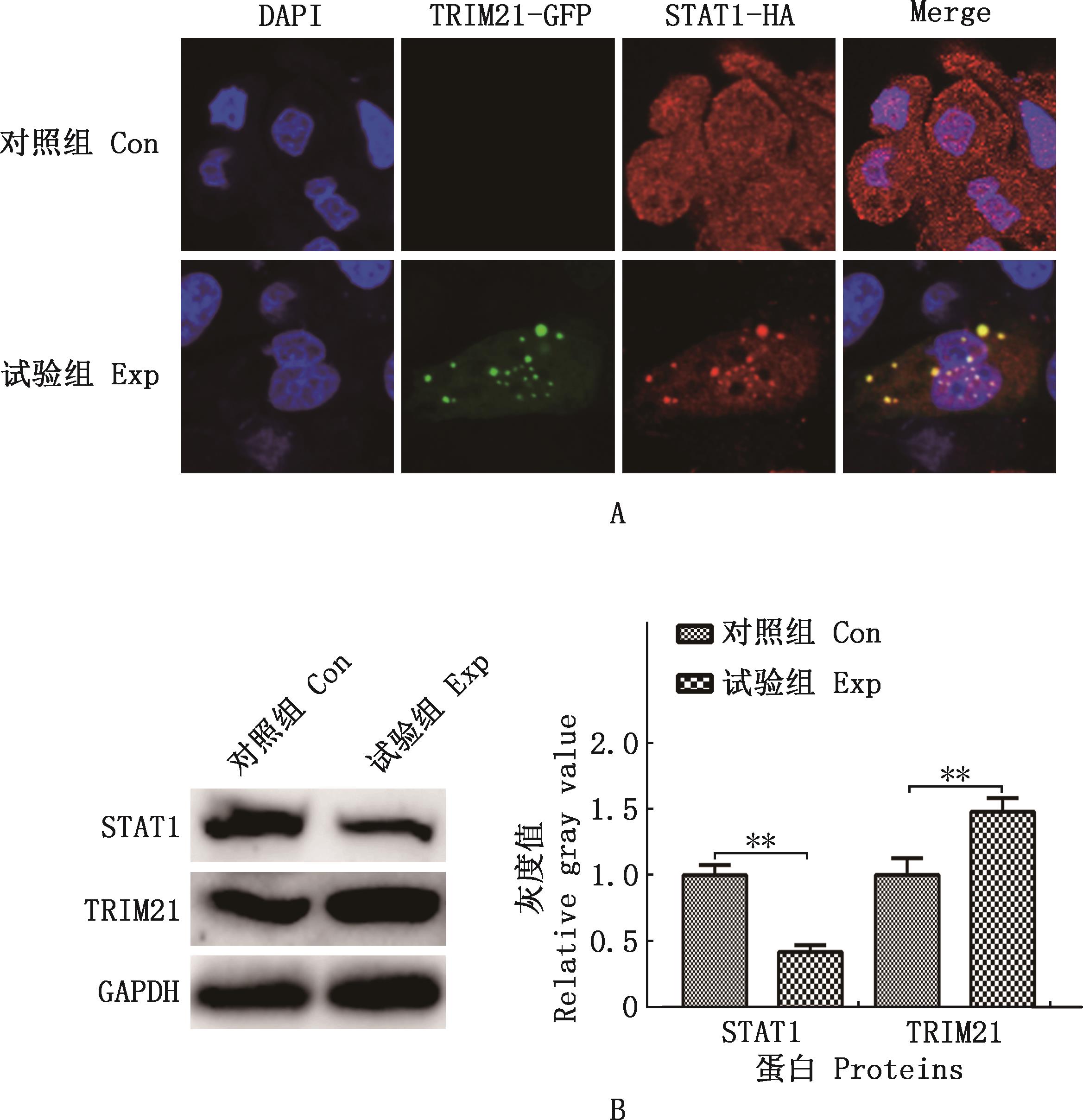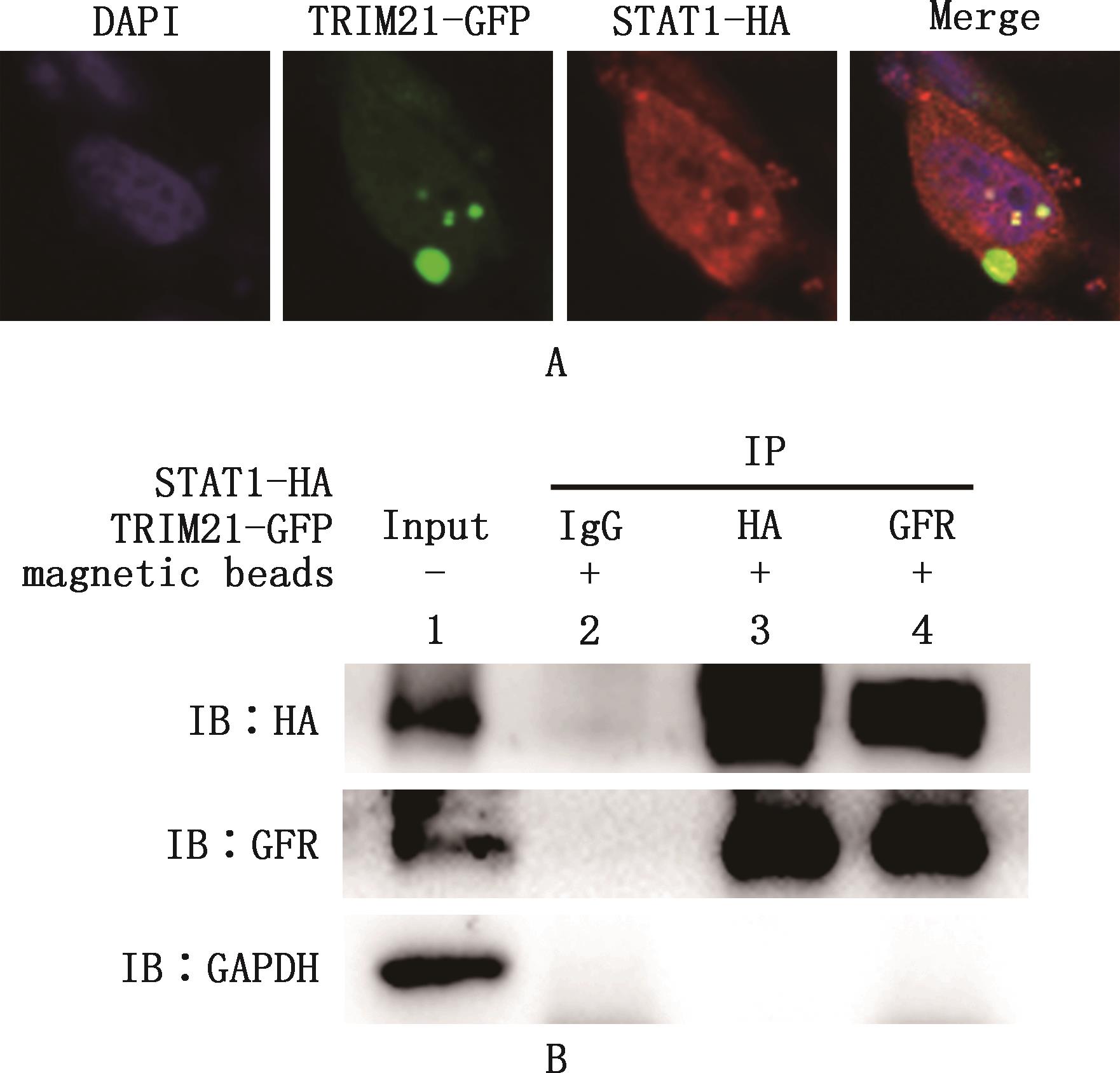 Validation of the interaction between STAT1 and TRIM21 proteins①A, Co-localization of STAT1-HA and TRIM21-GFP in IPEC-J2 cells (400×); B, Co-immunoprecipitation analysis of STAT1-HA and TRIM21-GFP interaction. ②1, Total cell lysate; 2, Co-immunoprecipitation with IgG antibody; 3, Co-immunoprecipitation with anti-HA antibody; 4, Co-immunoprecipitation with anti-GFP antibody"