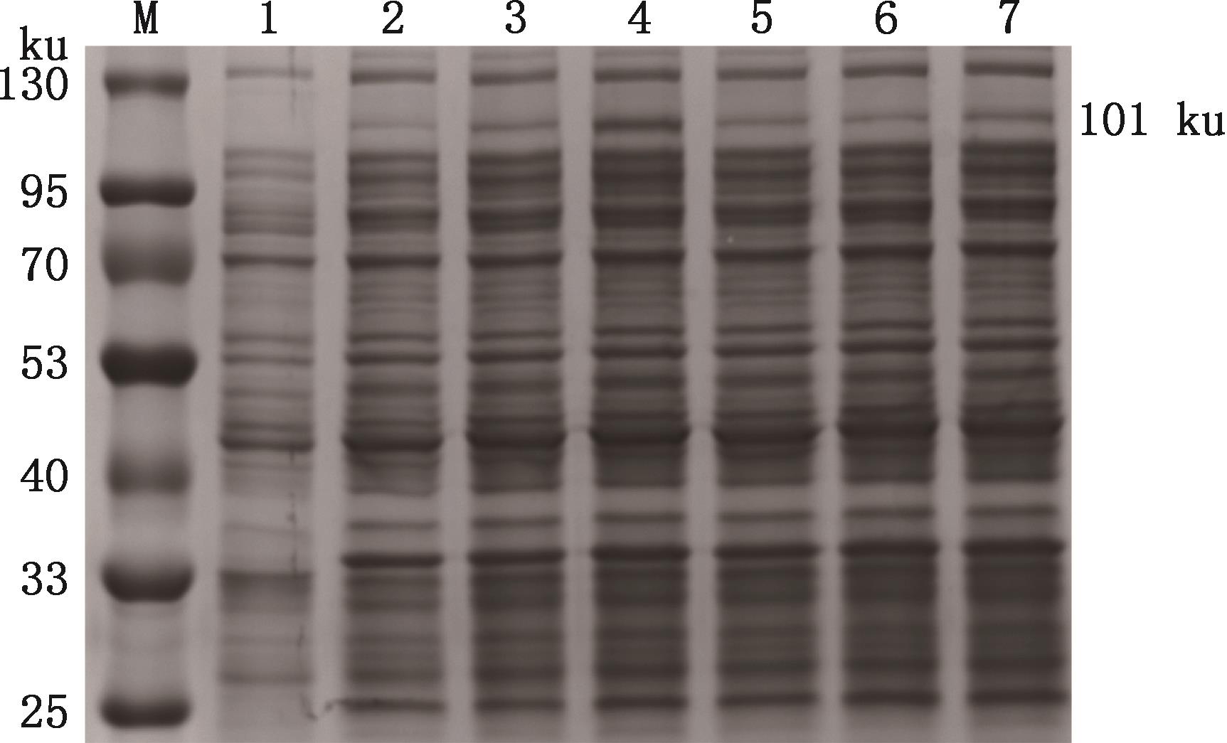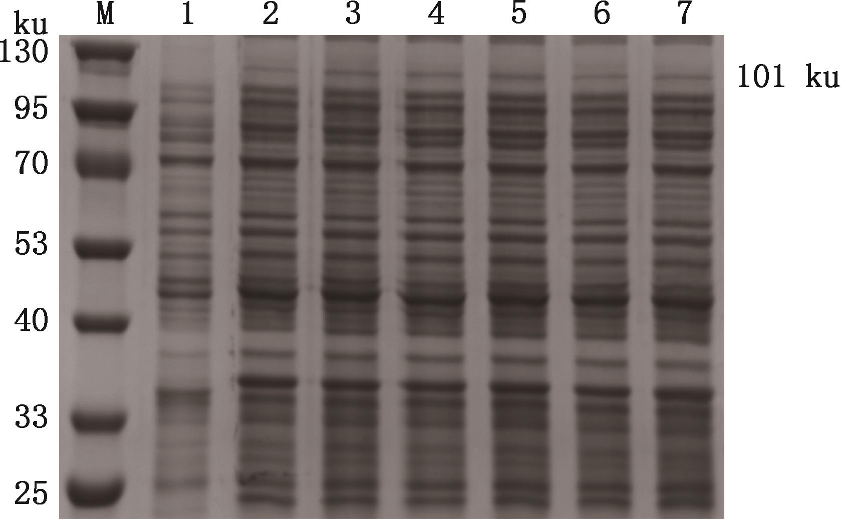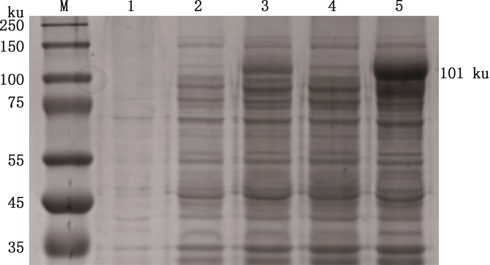 SDS-PAGE analysis of induced expression of chicken DDX21 recombinant proteinM, NcmColor Prestained Protein Marker (14-250 ku); 1, Bacterial culture of empty vector; 2, Bacterial culture of recombinant protein without induction; 3, Bacterial culture of recombinant protein after induction; 4, Supernatant of sonicated bacterial culture after induction; 5, Pellet of sonicated bacterial culture after induction"