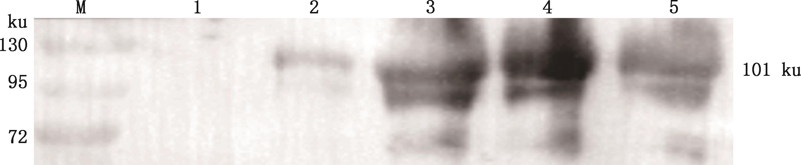 Western blotting analysis of induced expression of chicken DDX21 recombinant proteinM, Broad Range Rainbow Molecular Weight Marker (10-130 ku); 1, Bacterial culture of empty vector; 2, Bacterial culture of recombinant protein without induction; 3, Bacterial culture of recombinant protein after induction; 4, Supernatant of sonicated bacterial culture after induction; 5, Pellet of sonicated bacterial culture after induction"