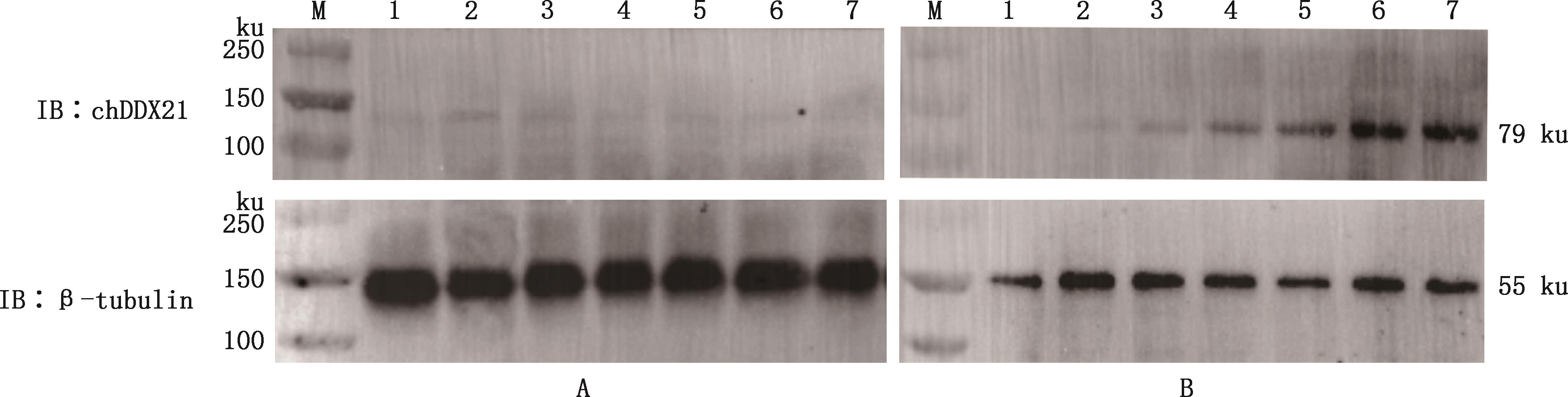 Western blotting analysis of expression of DDX21 protein in tissues of healthy and infected chickens①A, The expression of DDX21 protein in tissues of healthy chickens; B, The expression of DDX21 protein in tissues of chickens infected with H9N2 subtype AIV. ②M, Broad Range Rainbow Molecular Weight Marker (10-130 ku); 1, Bursa of Fabricius; 2, Liver; 3, Lung; 4, Heart; 5, Thymus; 6, Brain; 7, Spleen"