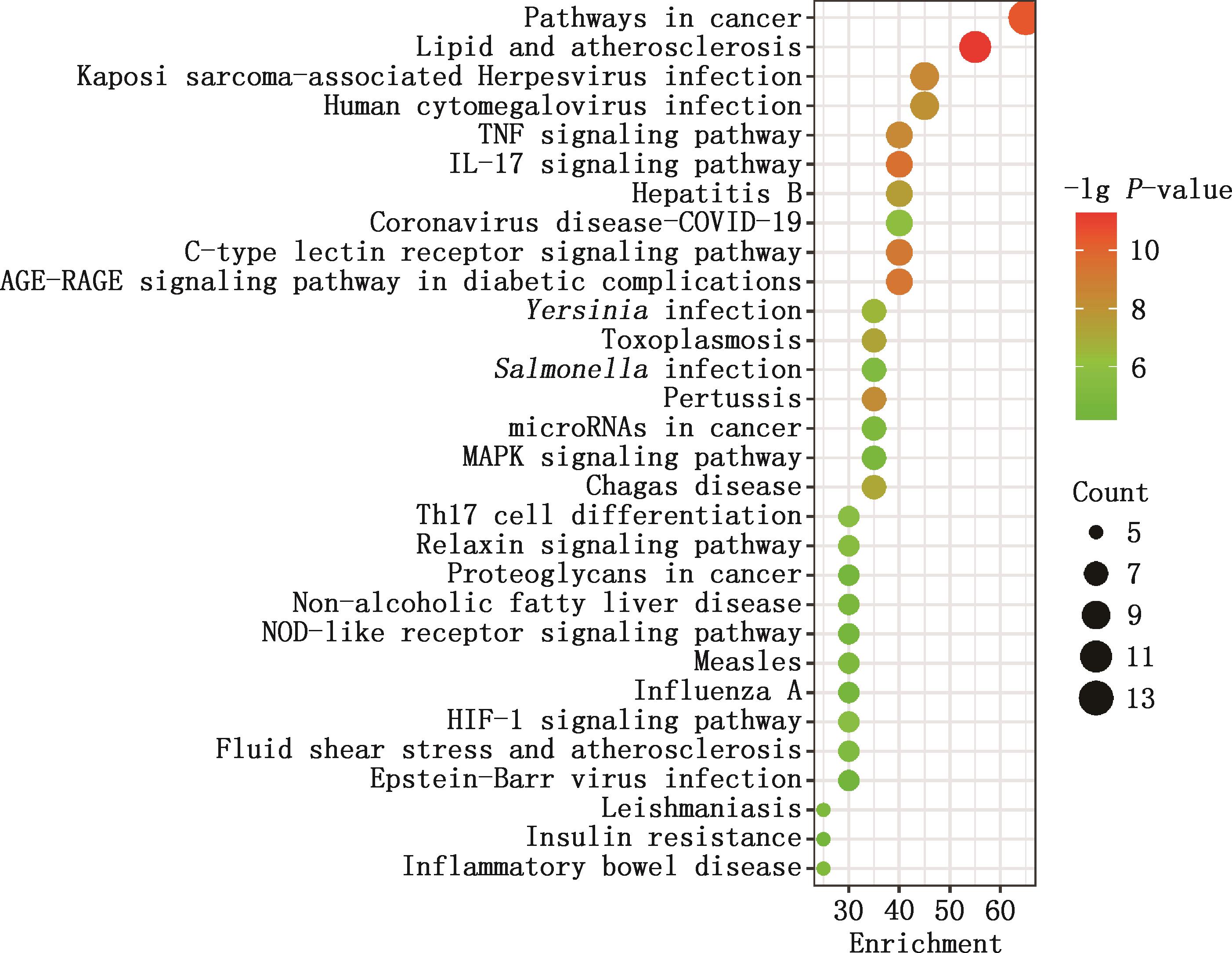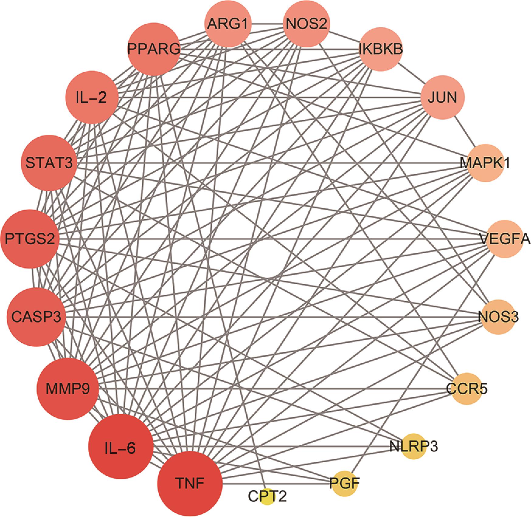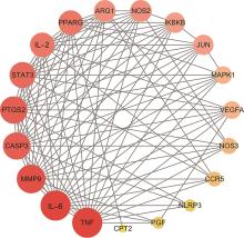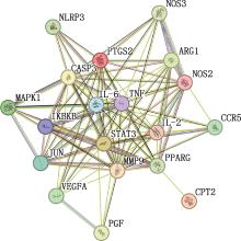 Objective Through the use of network pharmacology, molecular docking, and cell experiments, this study aimed to explore the therapeutic mechanism of Maxing Shigan decoction against Mycoplasma bovis infection, providing scientific basis for the modernization of traditional Chinese medicine and new strategies for the treatment of Mycoplasma bovis infection. Method Relying on bioinformatics platforms such as TCMSP, PubChem and SwissTargetPrediction, the active ingredients of the constituent herbs in Maxing Shigan decoction and their related targets were screened. The targets of Mycoplasma bovis related diseases were obtained through GeneCards and OMIM databases. The STRING database was used to construct protein-protein interaction network, and Cytoscape 3.9.1 software was used for network topology analysis. Meanwhile, the DAVID platform was used for GO function and KEGG pathway enrichment analysis. Molecular docking and visualization were completed using PyMOL 2.4.0 and AutoDockTool 1.5.6 software. MDBK cells were divided into blank control group, model group, and low, medium, and high dose groups (2.5, 5 and 10 mg/mL) of Maxing Shigan decoction. Except for blank control group, all other groups were infected with Mycoplasma bovis PG45 with a multiplicity of infection of 1 000 for 4 h. After cleaning, they were replaced with drug containing medium or complete medium, and continued to be cultured for 24 h. Real-time quantitative PCR was used to detect the Ct value and the mRNA expression of relevant inflammatory factors in each group of cells. Result Network pharmacology analysis revealed that Maxing Shigan decoction contained 134 active ingredients, and there were 93 targets related to Mycoplasma bovis-related diseases. A total of 20 intersection targets were identified between them, among which interleukin-6 (IL-6), tumor necrosis factor-α (TNF-α), matrix metallo proteinase 9(MMP9), caspase 3 (CASP3) and prostaglandin peroxide synthase 2 (PTGS2) were the key core targets. GO function enrichment analysis mainly involved positive regulation of transcription by RNA polymerase Ⅱ, extracellular space, cytoplasm, nucleus, cytokine activity, etc. KEGG pathway enrichment analysis mainly covered signaling pathways related to IL-17, TNF, mitogen-activated protein kinase (MAPK),etc. The molecular docking results showed that the binding energy of the active ingredients of Maxing Shigan decoction was less than -17.8 kJ/mol, and had good binding ability. Among them, quercetin had the smallest binding energy to CASP3, which was -28.87 kJ/mol. Cell experiments showed that compared with model group, the Ct values were significantly increased (P<0.05), the expression of IL-2 and IL-10 genes were significantly upregulated (P<0.05), while those of IL-6, IL-8, TNF-α, IL-17A,CASP3, MMP9 and PTGS2 genes were significantly downregulated (P<0.05), in each dose group of Maxing Shigan decoction. Conclusion Through network pharmacology prediction and cell experimental validation, this study revealed that Maxing Shigan decoction exered anti-Mycoplasma bovis infection effects by acting on targets such as IL-6, TNF and MMP9, regulating the secretion of inflammatory factors, and inhibiting inflammatory responses.